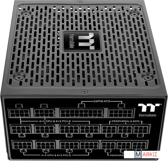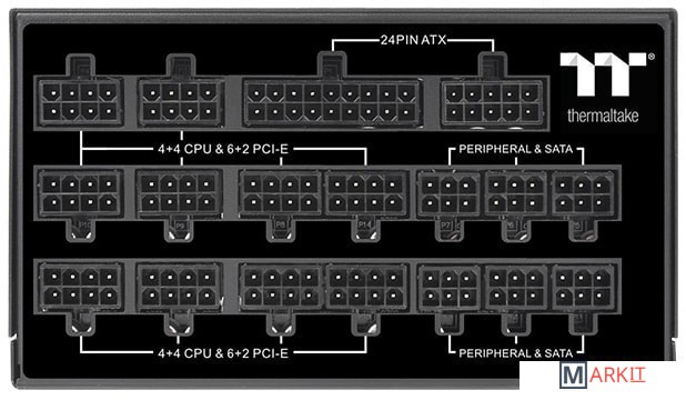 Toughpower TF1 Titanium создан специально для оверклокеров и владельцев самых мощных систем, которым важна высочайшая мощность, стабильность и эффективность. Уровень пульсаций менее 30мВ, отклонение напряжений на выходных линиях не более 2%, а время удержаний нагрузки без питающего напряжения около 16мсек. Схема блока питания имеет низкую переходную характеристику, систему низкого пускового тока (менее 50А) и защиту от скачков выходного тока при перегрузке по линии 12В.При нажатии на кнопку Turbo Fan, вентилятор блока питания принудительно раскручивается на максимальное значение 2400±10% об/мин для быстрого охлаждения всех электронных компонентов.В комплект к Toughpower TF1 Titanium поставляется специальный разъем для возможности питать видеокарты без подключения к материнской плате. Это будет очень полезно если в вашей система используется больше одного блока питания.Полностью модульная система подключения кабелей позволяет использовать только те кабели, которые нужны при сборке, минимизируя при этом их кол-во, что положительно сказывается на качестве продуваемости внутри корпуса.Благодаря тому, что профиль кабелей плоский, их легче прокладывать в корпусе.