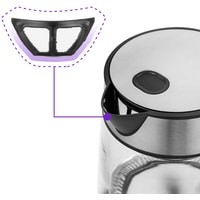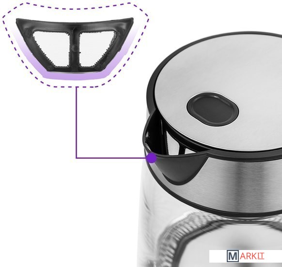 В носике чайника расположен съёмный нейлоновый фильтр, который задерживает частички накипи и предотвращает их попадание в чашку.