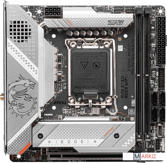 Материнская плата MPG Z790I EDGE WIF представлена в серебристо-белом оформлении. Стильный дизайн сочетается в ней с отличной производительностью.Серия MPG привлекает пользователей сочетанием высокой производительности и уникального стиля. Все больше геймеров, следуя современным тенденциям, хотят подчеркнуть свою индивидуальность. Именно поэтому серия MPG фокусируется не только на мощности линейки устройств, но и на их внешнем виде.Увеличенный радиаторБлагодаря увеличенному радиатору увеличивается общая площадь теплорассеяния, что способствует эффективному охлаждению под высокими нагрузками.Чипсетный радиатор FrozrЭффективное решение для охлаждения чипсета: радиатор с вентилятором.Тепловая трубкаСоединяет два радиатора системы питания, чтобы увеличить общую площадь теплорассеяния.Теплорассеиватель для транзисторовТеплорассеиватель для транзисторов На обратной стороне платы располагается теплорассеиватель, который способствует охлаждению силовых транзисторов..Термопрокладка – 7 Вт/(м·K)На транзисторах системы питания имеются термопрокладки с повышенной теплопроводностью, составляющей 7 Вт/(м·K). Дополнительными термопрокладками также снабжены дроссели.Система охлаждения M.2 Shield FROZR с радиатором чипсетаПредназначена для SSD в слотах M.2 и предотвращает падение производительности, которое может случиться из-за перегрева.Поддерживаются процессоры 12-/ 13-го поколения Intel® Core™, Pentium® Gold и Celeron® для сокета LGA 1700Поддерживается память DDR5, до 8000+(OC) МГцВысокоскоростные интерфейсы: слоты PCIe 5.0, Lightning Gen 4 x4 M.2, USB 3.2 Gen 2x2Мощная система питания: Duet Rail по схеме 10+1+1 фаз, Core Boost, Memory BoostЭффективное охлаждение: большой радиатор с тепловой трубкой, термопрокладки на катушках с теплопроводностью 7 Вт/(м·K), технология M.2 Shield Frozr2.5G Ethernet и Intel Wi-Fi 6E: высокоскоростное и стабильное проводное и беспроводное сетевое подключение для широкого спектра приложенийАудиосистема AUDIO BOOST 5: высококачественное звучание, создающее неповторимую атмосферу в играхВысококачественная конструкция: 12-слойная печатная плата, изготовленная по серверным стандартамПредустановленная панель ввода/вывода: защищает от электромагнитных помех и облегчает установку материнской платы